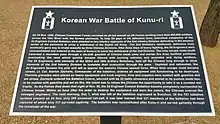 The Korean War Memorial is a gray, square stone that has the outline of the country of Korea that includes a line showing where the 38th parallel is located. That line shows where the country is now split into North Korea and South Korea. It also lists how many soldiers were casualties, wounded, captured or missing during the war. It also includes a US Army Corps of Engineers castle and plaque commemorating the 2nd Engineer Battalion's participation and heavy losses during the Battle of Kunu-ri.
