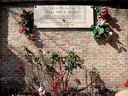 "Las Trece Rosas" (the Thirteen Roses) is the name given in Spain to a group of thirteen young women who were executed by a Francoist firing squad just after the conclusion of the Spanish Civil War. Their execution was part of a massive execution campaign known as the "saca de agosto", which included 43 young men (among them a fourteen-year-old).[1]