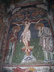 The church is avidly adorned with frescoes, dated to the latter half of the 14th century and beginning of the 15th. The style of the paintings is a local take on the late Byzantine Palaeologan art, executed in a characteristically coarse manner. Inside the building, the conch and walls bear a series of frescoes depicting a Christological cycle, church fathers, and various saints. The outer walls also contain frescoes—now partly faded—including the hunting of Saint Eustace on the east façade, haloed horsemen on the south, the Deesis on the west, and uniquely, scenes from the medieval Georgian romance Amiran-Darejaniani on the north. The paintings are accompanied by explanatory inscriptions in the medieval Georgian asomtavruli script.[3]