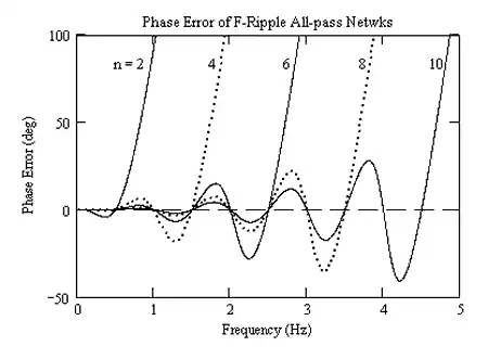 The phase error responses for the even order networks from n = 2 to n = 10 have been plotted in the accompanying figure.