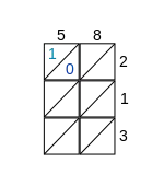 As an example, consider the multiplication of 58 with 213. After writing the multiplicands on the sides, consider each cell, beginning with the top left cell. In this case, the column digit is 5 and the row digit is 2. Write their product, 10, in the cell, with the digit 1 above the diagonal and the digit 0 below the diagonal (see picture for Step 1).