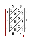 A grid is drawn up, and each cell is split diagonally. The two multiplicands of the product to be calculated are written along the top and right side of the lattice, respectively, with one digit per column across the top for the first multiplicand (the number written left to right), and one digit per row down the right side for the second multiplicand (the number written top-down). Then each cell of the lattice is filled in with product of its column and row digit.