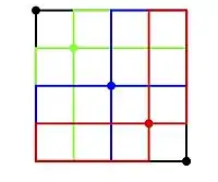 Superimpose the NE lattice paths squared onto the same rectangular array, as seen in the figure below. We see that all NE lattice paths from to are accounted for. In particular, notice that any lattice path passing through the red lattice point (for example) is counted by the squared set of lattice paths (also shown in red).
