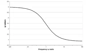 The prototype lattice filter shown here passes low frequencies without modification but phase shifts high frequencies. That is, it is phase correction for the high end of the band. At low frequencies the phase shift is 0° but as the frequency increases the phase shift approaches 180°. It can be seen qualitatively that this is so by replacing the inductors with open circuits and the capacitors with short circuits, which is what they become at high frequency. At high frequency the lattice filter is a cross-over network and will produce 180° phase shift. A 180° phase shift is the same as an inversion in the frequency domain, but is a delay in the time domain. At an angular frequency of ω = 1 rad/s the phase shift is exactly 90° and this is the midpoint of the filter's transfer function.
