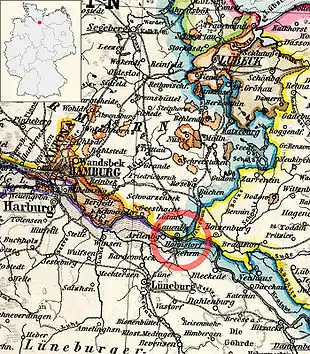 The Lauenburg-Hohnstorf Ferry (German: Trajekt Lauenburg-Hohnstorf or Lauenburg-Hohnstorfer Elb-Traject-Anstalt) was a railway ferry over the River Elbe between Hohnstorf on the left bank of the Elbe in the old Kingdom of Hanover (which became the Prussian province of Hanover in 1866) and Lauenburg in the Duchy of Lauenburg on the right bank which was then part of Denmark. From 15 March 1864 to 1 November 1878 the rail ferry linked the Lübeck–Lauenburg railway with the Lüneburg–Hohnstorf line. Both were sections of the Lübeck–Lüneburg railway.