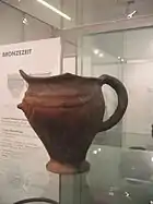 The term, coined in 1927 by Gero von Merhart, initially included only Melaun (also Mellaun), a village near Brixen. The pitcher of Laugen, found at Villanders and preserved at the South Tyrol Museum of Archaeology, is a typical example of this culture: it has a triangular nozzle, a decorative outer grooves, and a height of 18.3 cm ; next to the handle are two horn-shaped appendices.