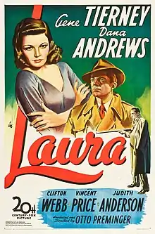 Laura is a 1944 American film noir produced and directed by Otto Preminger. It stars Gene Tierney, Dana Andrews, and Clifton Webb along with Vincent Price and Judith Anderson. The screenplay by Jay Dratler, Samuel Hoffenstein, and Betty Reinhardt is based on the 1943 novel Laura by Vera Caspary. Laura received five nominations for the Academy Awards, including for Best Director, winning for Best Black and White Cinematography.