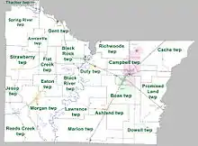 Townships in Arkansas are the divisions of a county. Each township includes unincorporated areas; some may have incorporated cities or towns within part of their boundaries. Arkansas townships have limited purposes in modern times. However, the United States census does list Arkansas population based on townships (sometimes referred to as "county subdivisions" or "minor civil divisions"). Townships are also of value for historical purposes in terms of genealogical research. Each town or city is within one or more townships in an Arkansas county based on census maps and publications. The townships of Lawrence County are listed below; listed in parentheses are the cities, towns, and/or census-designated places that are fully or partially inside the township. [15][16]
