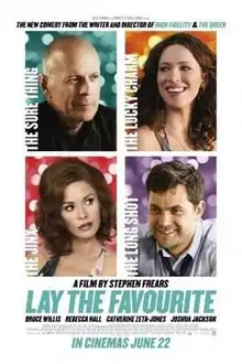 Lay the Favorite (promoted as Lay the Favourite in the UK) is a 2012 American comedy-drama film directed by Stephen Frears and written by D.V. DeVincentis, and stars Bruce Willis, Rebecca Hall, Catherine Zeta-Jones and Joshua Jackson. Based on Beth Raymer's 2010 memoir of the same name, the film follows a young, free-spirited woman as she journeys through the legal and illegal world of sports gambling. It premiered at the 2012 Sundance Film Festival on January 21 and was released on December 7 by The Weinstein Company through its RADiUS-TWC distribution arm. Lay the Favorite garnered negative reviews from critics, praising the performances of Willis and Hall but felt there was unexplored development in the characters and the gambling world. The film was a box-office bomb, grossing $1.5 million against a production budget of $20 million.