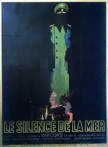 Le Silence de la mer (literal English translation: The Silence of the Sea) is a 1949 film by Jean-Pierre Melville. It was his first feature film and was based on the 1942 book of the same name by "Vercours" (the pen name of Jean Bruller). Set during WWII in occupied France, the story concerns the relationship of a Frenchman (Jean-Marie Robain) and his niece (Nicole Stéphane) with a German lieutenant, Werner von Ebrennac (Howard Vernon), who is billetted in their house. Most of the film was actually shot inside Bruller's own home outside of Paris.
