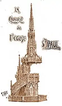 From the outset, sculpture was an integral part of Geefs' pulpit design, which featured representations of the saints Peter, Paul, Hubert the first Bishop of Liège, and Lambert of Maastricht. A drawing of the pulpit by the Belgian illustrator Médard Tytgat, published in 1900, shows the front; Le génie du mal would be located at the base of the stairs on the opposite side, but the book in which the illustration appears omits mention of the work.[7]