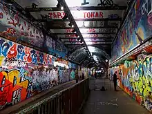 Leake Street (also known as the Banksy Tunnel) is a road tunnel in Lambeth, London where graffiti is tolerated regardless of the fact that it is against the law. The street is about 300 metres long, runs off York Road and under the platforms and tracks of Waterloo station.[1]