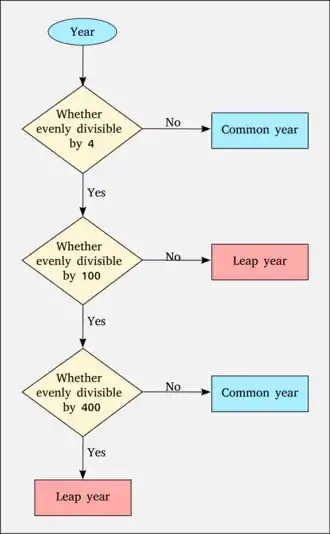 Every year that is exactly divisible by four is a leap year, except for years that are exactly divisible by 100, but these centurial years are leap years if they are exactly divisible by 400. For example, the years 1700, 1800, and 1900 are not leap years, but the years 1600 and 2000 are.[14]