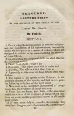 The lectures were published in 1835 as the "Doctrine" portion of the volume entitled Doctrine and Covenants of the Church of the Latter Day Saints: Carefully Selected from the Revelations of God. The lectures were selected for that volume by a committee appointed on September 24, 1834, by a general assembly of the church to arrange the doctrines and revelations of the church into a single volume. That committee of Presiding Elders, consisting of Joseph Smith, Oliver Cowdery, Sidney Rigdon, and Frederick G. Williams, stated that the lectures were included "in consequence of their embracing the important doctrine of salvation," and that the lectures, together with the church-regulatory sections that followed, represent "our belief, and when we say this, humbly trust, the faith and principles of this society as a body."[5][6] Accordingly, the church body accepted the committee's compilation on August 17, 1835, as "the doctrine and covenants of their faith, by a unanimous vote".[7]