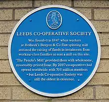Leeds Co-op was founded in 1847 as a Co-operative Flour Mill Society, workers at Benyon & Co's flax spinning mill raising funds through instalments to acquire some land. One of the founders was John Holmes, a draper. By the end of the year the co-op was selling flour cheaply to its members and the price of flour in the Borough of Leeds was lowered considerably.[1] A mill, The People's Mill, was built in Leeds, just opposite Marshall's Mill, but has since been demolished.