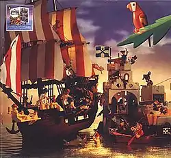 The Pirates were led by Captain Redbeard (called Captain Roger in some markets), distinguished by his black bicorne hat, left eye patch, peg leg on the right and a hook where his left hand was; his crew included First Mate Rummy and the young Bo'Sun Will. Another pirate leader was Captain Ironhook who has been suggested as a rival to Redbeard; both minifigures were similar except that Ironhook had a tattered shirt (some releases of Ironhook have a peg leg).[9] Their emblem was the Jolly Roger, a black flag featuring the skull and crossbones. 6285 Black Seas Barracuda was their first pirate ship while 6270 Forbidden Island was their original hideout, both released in 1989.[10] The catalogue releases for the Pirates expanded considerably with a larger base, 6273 Rock Island Refuge (1991), and then a pair of pirate ships in 1993 (the large 6286 Skull's Eye Schooner and small 6268 Renegade Runner).