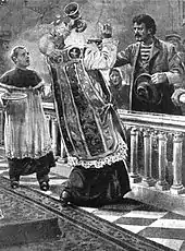 Heinrichs normally celebrated the 8 AM Sunday Mass, but on Sunday, February 23, 1908, as he had a meeting scheduled that day, he switched with the priest Wulstan Workman to take the 6 AM "Workingmen's Mass. Among attending Mass was fifty-year-old Giuseppe Alia (aka Giuseppe Guaraccio and Angelo Gabriele),[6] an unemployed shoemaker[7] who had recently emigrated from Avola, Sicily. Alia took Communion at altar rail then flung the Host at the priest and drew a revolver. Seeing the gun, the altar boy tried to warn the priest, but it was too late. Heinrichs attempted to retrieve the fallen host and collapsed mortally wounded on the step of the Altar of Our Lady,[4] and died minutes later.[8]