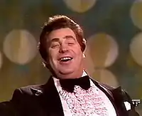 Many Russian songs are serious or sad, but Kharitonov also performed comic songs or arias. The composer Matvey Blanter wrote Dark-Eyed Cossack Girl (Russian: Черноглазая казачка) especially for him in 1966. Kharitonov's definitive performance was recorded in 1969.[20] Again he is celebrating Chaliapin's legacy as the first modern bass to successfully fuse drama — and humour — with pure musical technique, as in Chaliapin's performance of Dark Eyes.[21] Moreover, this performance of Kharitonov's demonstrates the Ensemble's style, which in the era of A.V. and B.A. Alexandrov encouraged soloists to stay in tune in spite of any vibrato, any emotional acting, or any humour. Therefore, although the song involves laughter, he laughs elegantly in tune. All the while he is making faces and humorous gestures, his vocal tone and pitch remain spot-on. That is the achievement of this kind of performance: while the audience and the other musicians laugh so much at Kharitonov's clowning (see image, left), at the same time they are aware of highly disciplined singing, and the performance remains perfectly musical.