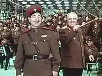 From 9 November 1953 to March 1965 he was a member of the choir in the Red Song and Dance Ensemble of the Soviet Army (later the Alexandrov Ensemble). His place in the choir was always third from the right in the top row. From 1953 to 1955 he served in both the Red Army and the choir. From 1956 to 1959, while still with the choir, he studied at Gnessin State Musical College. His first unofficial public performance as soloist was in the State Kremlin Palace on 18 March 1965. On that day two good friends of his, cosmonauts Pavel Belyaev and Alexei Leonov, traveled into space on the Voskhod 2. During this mission, Leonov became the first human to walk in space. Kharitonov's first official public performance as a soloist was on 22 April 1965.[4] In 1967 he was awarded Honoured Artist of Russia. He continued with the Ensemble until 1972 - so he was with them for nearly 20 years.[1][2][3] B.A. Alexandrov was proud of his soloist, and would often shake his hand or hug him publicly onstage after a performance.[5] Kharitonov sometimes sang duets, but only with Ivan Bukreev.[6] Kharitonov had only one singing teacher in his life: Evgeny Avgustovich Kanger, who taught no-one in the Ensemble but the leading soloists, including Evgeny Belyaev.