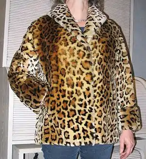 Animal print is a clothing and fashion style in which the garment is made to resemble the pattern of the skin and fur of an animal such as a leopard, cheetah, snow leopard, jaguar, zebra, tiger, clouded leopard, margay, ocelot, spotted hyena, striped hyena, African wild dog, constrictor snake, dalmatian, giraffe or monkey. Animal print is also used for room decoration, handbags and footwear and even some jewelry.[1] A major difference between animal prints and fur clothing is that animal prints today very often use fake fur instead of animal coat.