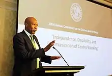 Lesetja Kganyago (born 7 October 1965) is a South African economist and central banker. He is the Governor of the South African Reserve Bank (SARB).[1] He was appointed to that post on 6 October 2014, by Jacob Zuma, the former President of the Republic of South Africa (RSA).[2] He assumed the Governorship of the South African Reserve Bank on 9 November 2014, following the expiry of the term of his predecessor Gill Marcus, on 8 November 2014.[3]