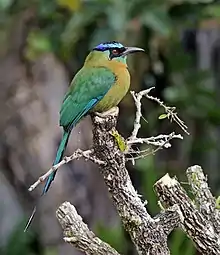 Lesson's motmot (Momotus lessonii) or the blue-diademed motmot, is a colorful near-passerine bird found in forests and woodlands of southern Mexico to western Panama. This species and the blue-capped motmot, whooping motmot, Trinidad motmot, Amazonian motmot, and Andean motmot were all considered conspecific.