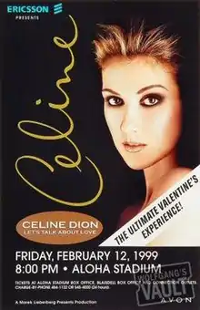 The Let's Talk About Love World Tour is the eighth concert tour by Canadian recording artist Celine Dion. Visiting North America, Asia and Europe; the trek supported Dion's fifth English studio album Let's Talk About Love and her eleventh French studio album, S'il suffisait d'aimer. The tour marks Dion's last worldwide tour until her Taking Chances World Tour in 2008–2009. Initially planned for 1998, the success of the tour continued into 1999. In 1998, the tour earned nearly $30 million from its concerts in North America alone.[1] In Japan, tickets were immediately sold out on the first day of public sale.[2] It was also nominated for "Major Tour of the Year" and "Most Creative Stage Production" at the Pollstar Industry Awards.[3] Overall, the tour grossed about $91.2 million from 69 reported shows.