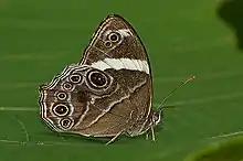 It is about 50–55 mm in expanse with the upper surface of wings predominantly brown in colour. The forewing has a sub-apical white band and pale spot on the apex. Underside of the hindwing has a large ocellus or and a series of spots along the margin. It is found in bamboo forests.