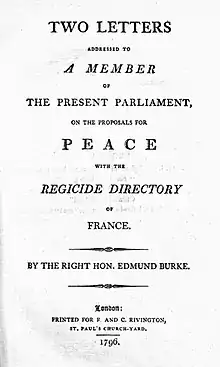 Letters on a Regicide Peace or Letters ... on the Proposals for Peace with the Regicide Directory of France were a series of four letters written by Edmund Burke during the 1790s in opposition to Prime Minister William Pitt's seeking of peace with the revolutionary French Directorate. It was completed and published in 1796.