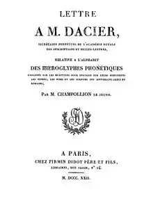Lettre à M. Dacier (full title: Lettre à M. Dacier relative à l'alphabet des hiéroglyphes phonétiques: "Letter to M. Dacier concerning the alphabet of the phonetic hieroglyphs") is a scientific communication in the form of a letter sent in 1822 by the Egyptologist Jean-François Champollion to Bon-Joseph Dacier, secretary of the French Académie des Inscriptions et Belles-Lettres. It is the founding text upon which Ancient Egyptian hieroglyphics were first systematically deciphered by Champollion, largely on the basis of the multilingual Rosetta Stone.