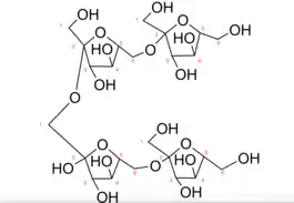 Levan is a naturally occurring fructan present in many plants and microorganism species.[1] The original discovery of levan began through research interests in a traditional Japanese dish known as natto.[2] Natto was known to be a sort of "superfood" which promoted health and longevity in Japan during the late 1800s.[2] In 1881, Lippmann first discovered "lävulan" (levan) as the remaining gum from molasses produced in the sugar beet companies.[3] Later on in 1901, Greig-Smith coined the name “levan” based on the levorotatory properties of this substance in polarized light. This polymer is made up of fructose, a monosaccharide sugar, connected in 2,6 beta glycosidic linkages. Levan can be in both branched and linear structures of relatively low molecular weight.[4] In the branched version, levan forms a very small, sphere-like structure.[5] This structure has basal chains of 9 units long which contain 2,1 branching, allowing for the methyl ethers to form and create a spherical shape. The ends of levan also tend to contain a glucosyl residue.[6] The branched structure of levan tends to be more stable than the linear structure.[2] However, the amount of branching and length of polymerization tends to vary among different species.[6] The shortest levan is 6-kestose, essentially a chain of two fructose molecules and a terminal glucose molecule.