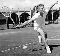 While he was in service, Hoad devised a weight-lifting exercise, doing push-ups with round 50 lb. weights placed on his back, which Hoad later believed probably initiated his back trouble. Hoad left the National Service at the end of April and his third overseas tour with an Australian team started on 5 May.[104] For the first time in his career, Hoad was the top-seeded player at a Grand Slam tournament at the French Championships but he lost in the fourth round to 40-year-old Gardnar Mulloy.[105][106] Hoad lost the doubles final with Rosewall to Seixas and Trabert in 56 minutes. Partnering Maureen Connolly, who had won the women's singles title, Hoad won the mixed-doubles final against Jacqueline Patorni and Rex Hartwig.[107] In June, Hoad overcame countryman Rose in the final of the Queen's Club Championship to successfully defend his title.[108] Hoad was seeded second behind Trabert at Wimbledon Championships.[109] In the fourth round, Hoad avenged his loss to Mulloy at the French Championships, defeating him in four sets.[110] In the quarterfinal the powerful service and excellent returns of Drobný proved too much for Hoad and he was beaten in straight sets within an hour.[111] Hoad and Rosewall were unable to defend their Wimbledon doubles title after losing in fives sets in the semifinal to Seixas and Trabert.[112] A surprise loss against Roger Becker in the semifinal at the Midlands Counties Championships in Birmingham was followed in mid-July by winning the singles title at the Swiss Championships in Gstaad.[113][114] As in the previous year, Hoad met Rosewall in the Eastern Grass Court Championships in August, this time in the final, and again the titleholder was victorious, overpowering Rosewall to win the singles title in three straight sets.[115] At Newport in mid August, Hoad was beaten by 17-year-old compatriot Roy Emerson who won the deciding set 8–6.[116][117] For the third time in 1954, Seixas and Trabert defeated Hoad and Rosewall at a Grand Slam doubles event, winning the U.S. Doubles Championships in Brookline.[118]