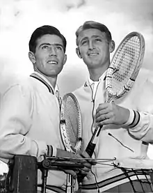 Hoad started 1953 poorly in the singles with a second-round exit against Clive Wilderspin at the Australian Championships in Melbourne after playing an uncharacteristic baseline game.[44][45] He was more successful in doubles where he and Rosewall became the youngest team to win the Australian doubles title after a victory in the final against Mervyn Rose and Don Candy.[46] In March, Hoad defended his singles title at the Australian Hardcourt Championships, defeating Rosewall in a five set semifinal in which he survived six matchpoints, and 34-year-old John Bromwich in the final.[47][48][49] Two weeks later, Hoad lost the final of the N.S.W. Hardcourt Championships against Mervyn Rose.[50] Hoad's second overseas tour started in late April, and after an exhibition in Cairo at the Gezira Sporting Club, he reached the final at Italian Championships in Rome losing to Drobný in straight sets but won the doubles title with Rosewall.[51][52][53] At the French Championships in May, Hoad was seeded fourth and made it to the quarterfinals in which he lost to Vic Seixas due to overhitting and an unreliable serve.[54][55] Hoad and Rosewall won the doubles title with a three-set win in the final against countrymen Rose and Wilderspin.[56] In June Hoad's attacking serve-and-volley game proved too good for Wimbledon favorite Rosewall in the final of the Queen's Club Championship and he won the tournament without losing a set.[57][58] At Wimbledon, Hoad was seeded sixth, and as at the French, Vic Seixas defeated him in the quarterfinal, this time in a close five-set match that ended on a Hoad double fault.[59][60] In an all-Australian doubles final Hoad and Rosewall defeated Hartwig and Rose.[61] Hoad lost to Enrique Morea in the final of the Dutch Championships in mid July.[62] He won his first title on U.S. soil in South Orange at the Eastern Grass Court Championships in mid August, defeating compatriot Rex Hartwig in the final.[63][64] In the semifinal against Rosewall, he pulled a back muscle.[65] Hoad and Rosewall's hopes of winning the doubles Grand Slam, two years after fellow Australians Ken McGregor and Frank Sedgman had first achieved that feat, were dashed when they lost surprisingly in the third round of the U.S. Doubles Championships.[66] At the U.S. Championships[67] Hoad (second foreign seed) won four matches to reach the semifinal where for the third time in 1953 he lost in a Grand Slam event to Vic Seixas.[68] Following his defeat, and that of Rosewall in the other semifinal, there was criticism in the press that both 18-year-old players were physically and mentally worn out due to the intensive schedule imposed by coach Harry Hopman.[69][70] In September, Seixas again beat Hoad, this time in the semifinal of the Pacific Southwest Championships in Los Angeles.[71]