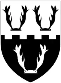 - 1st: Per fess embattled argent and sable, three buck's attires each fixed to the scalp counterchanged (Buck);