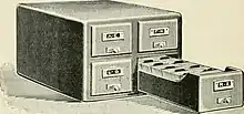 Dewey and others devised a system where books were organized by subject, then alphabetized based on the author's name. Each book was assigned a call number which identified the subject and location, with a decimal point dividing different sections of the call number. The call number on the card matched a number written on the spine of each book.[15] In 1860, Ezra Abbot began designing a card catalog that was easily accessible and secure for keeping the cards in order; he managed this by placing the cards on edge between two wooden blocks. He published his findings in the annual report of the library for 1863 and they were adopted by many American libraries.[12]