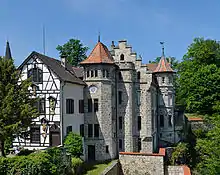 Lichtenstein Castle (Schloss Lichtenstein) is a privately-owned Gothic Revival castle located in the Swabian Jura of southern Germany. It was designed by Carl Alexander Heideloff[1] and its name means "shining stone" or "bright stone".[2] The castle overlooks the Echaz valley near Honau, Reutlingen in the state of Baden-Württemberg. The modern castle was inspired by Wilhelm Hauff's 1826 novel Lichtenstein and was built in 1840–1842. The ruins of an older medieval castle are a few hundred meters away.