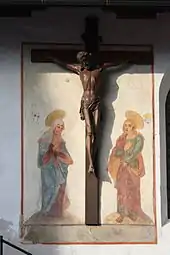 The crucifixion scene at the staircase on the south side was created in the 17th century when Maria and Magdalena were painted on plaster on either side of a wooden crucifix. On the cross hung a corpus from the period around 1490, part of the late Gothic decoration of the neighbouring parish church where it found a place in its choir in 1979.[1]