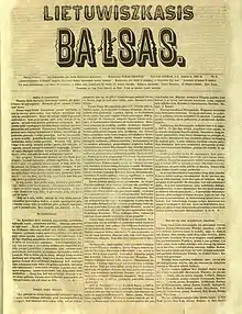 Lietuviškasis balsas (original spelling: Lietuwiszkasis Bałsas; literally: The Lithuanian Voice) was a Lithuanian-language newspaper published by Jonas Šliūpas from July 1885 to February 1889 in New York City and Shenandoah, Pennsylvania. It promoted the Lithuanian National Revival. Due to financial difficulties, it appeared irregularly. It competed with pro-Polish and pro-Catholic Vienybė lietuvninkų and was discontinued after 96 issues in early 1889. The competition and ideological debate between the two newspapers identified the two main branches of the Lithuanian movement – rationalist nationalists and conservative Catholics.[1]