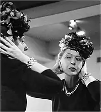 In 1937, Daché moved her entire millinery business to a nine-story New York City building at 78 East 56th Street called the House of Dache.[6] Here she made her retail sales directly to customers, a wholesale trade to middle management, a workroom, and a penthouse residence.[5] The clothing designer Halston and the hair stylist Kenneth were her employees for awhile and then went into business for themselves. Daché's yearly production of custom headgear was estimated as high as 9,000 hats a year.[20] She worked with Hollywood costume designer Travis Banton by providing his movie stars like Gloria Swanson, Carmen Miranda, Bette Davis, and Betty Grable with the needed fashion hats to complement their costumes.[21][22][23] She also provided hats for Joan Crawford, Marlene Dietrich, Marion Davies, Gertrude Lawrence, Sonja Henie, Audrey Hepburn, and Carole Lombard.[24]
