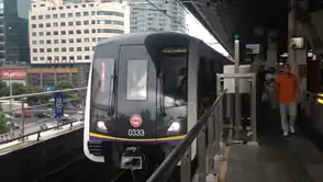 Because it shares tracks with Line 4, Line 3 operates on a comparatively looser schedule, with an average interval of around 7 minutes (5 minutes in the peak hours). However, riders can expect a 2-minute train interval at any one of the shared-line stations during rush hour. To avoid confusion, Line 3 trains have the number 3 painted on the sides of trains, and Line 4 trains the number 4. During trail operation, headways were 30 minutes, reduced to 15 minutes in September 2001.[8] The line was extremely popular with 15,000 passengers on the first day[9] and 30,000 after three day.[10]