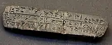 Linear B is a syllabic script that was used for writing Mycenaean Greek, the earliest attested form of Greek. The script predates the Greek alphabet by several centuries. The oldest Mycenaean writing dates to about 1400 BC.[1] It is descended from the older Linear A, an undeciphered earlier script used for writing the Minoan language, as is the later Cypriot syllabary, which also recorded Greek. Linear B, found mainly in the palace archives at Knossos, Cydonia,[2] Pylos, Thebes and Mycenae,[3] disappeared with the fall of Mycenaean civilization during the Late Bronze Age collapse. The succeeding period, known as the Greek Dark Ages, provides no evidence of the use of writing. Linear B, deciphered by English architect and self-taught linguist Michael Ventris[4]—based on the research of American Classicist Alice Kober[5]—is the only Bronze Age Aegean script to have thus far been deciphered.
