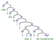 The most commonly used measure of syntax complexity is the mean length of utterance, also known as MLU.[25] This measure is independent from how often children talk and focuses on the complexity and development of their grammatical systems, including morphological and syntactic development.[26] The number representing a person's MLU corresponds to the complexity of the syntax being used. In general, as the MLU increases, the syntactic complexity also increases. Typically, the average MLU corresponds to a child's age due to their increase in working memory, which allows for sentences to be of greater syntactic complexity.[27] For example, the average MLU of a 7-year-old child is 7 words. However, children show more individual variability of syntactic performance with more complex syntax.[26] Complex syntax have a higher number of phrases and clause levels, therefore adding more words to the overall syntactic structure. Seeing as there are more individual differences in MLU and syntactic development as children get older, MLU is particularly used to measure grammatical complexity among school-aged children.[26] Other types of segmentation strategies for discourse are the T-unit and C-unit (communicative unit). If these two measurements are used to account for discourse, the average length of the sentence will be lower than if MLU is used alone. Both the T-units and C-units count each clause as a new unit, hence a lower number of units.