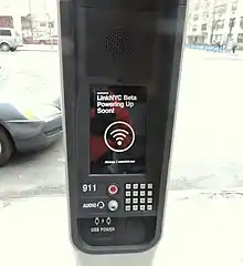 Each Link includes two free USB charging stations for smartphones as well as a phone that allows free calls to all 50 states and to Washington, D.C.[35] The Links allow people to make either phone calls (using the keypad and the headphone jack to the keypad's left), or video calls (using the tablet).[2][4][5][26] Vonage provides this free domestic phone call service as well as the ability to make international calls using calling cards.[20] The Links feature a red 9-1-1 call button between the tablet and the headphone jack,[4][40] and they can be used to call the information helpline 3-1-1 as well.[4][14][40] The Links can also be used for completing simple time-specific tasks[34] such as registering to vote.[41] In April 2017, the Links were equipped with another app, Aunt Bertha, which could be utilized to find social services such as food pantries, financial aid, and emergency shelter.[42] The Links sometimes offer eccentric apps, such as an app to call Santa's voice mail that was enabled in December 2017.[34] In October 2019, a video relay service for deaf users was added to the Links.[43]