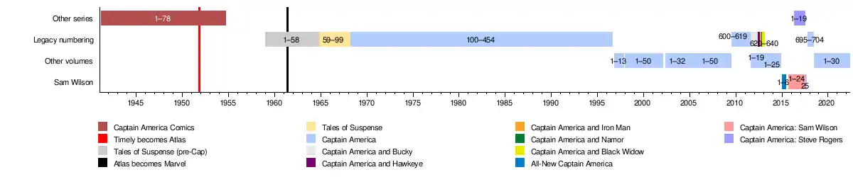 - Captain America Comics #1–75 (Timely Comics; March 1941 – February 1950)