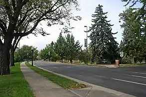The Alamo Placita neighborhood is named for Alamo Placita Park. The street in the foreground is the northbound part of Speer Boulevard.