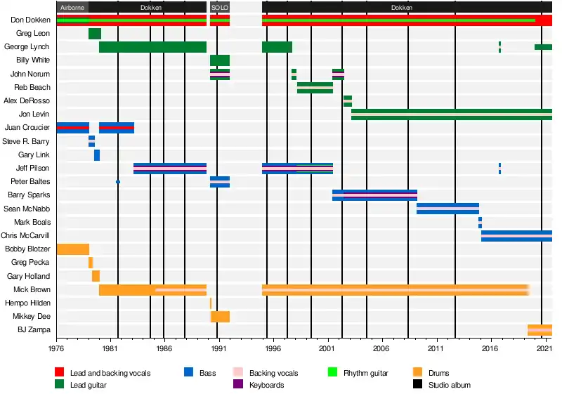 In late 1994, Lynch was convinced to reunite with Dokken to complete a reformation of the band's previous lineup, adding lead guitar overdubs to a new album released the next year, Dysfunctional.[17] However, after one more album, Shadowlife, Lynch left again in late 1997.[18] He was replaced by former Europe guitarist John Norum, who joined partway through an American tour before the end of the year.[19] By the next summer, former Winger and Alice Cooper guitarist Reb Beach had taken over the position.[20] Beach recorded one studio album, Erase the Slate, before Norum returned in July 2001.[21] The group started recording a new album, but in October 2001 it was announced that Pilson had been replaced for the sessions by bassist Barry Sparks, although this was initially not a full-time replacement.[22] The following month, however, Don Dokken confirmed that Pilson had officially left to focus on his various other projects.[23]