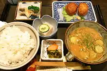 - Japanese curry - rice - imported in the 19th century by way of the United Kingdom and adapted by Japanese Navy chefs. One of the most popular food items in Japan today. Eaten with a spoon. Curry is often eaten with pickled vegetables called fukujinzuke or rakkyo