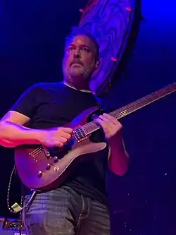 Rieflin was temporarily replaced again for an autumn 2017 tour by Chris Gibson.[27] For the band's 50th anniversary tour in 2019, it was announced that Rieflin would once more be temporarily replaced, this time by Theo Travis.[28] However, after a day of rehearsal, the band opted instead to do the 2019 tour as a seven-piece.[29] Rieflin's parts were divided among other band members, with Jakszyk and Collins adding keyboards to their on-stage rigs, and Levin once again using the synthesizer he used during the 1980s tours.[30] Rieflin died of cancer on March 23rd, 2020, reducing the lineup to a septet.[31]
