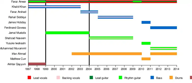 These are the line-ups of Mizraab, a progressive rock band from Karachi, Sindh, Pakistan, formed in 1997.[1] Founded by vocalist, lead guitarist and songwriter, Faraz Anwar, the band's initial line-up was with Faraz Anwar on vocals, Khalid Khan on bass and Akhtar Qayyum on percussions, since then there had been many changes in the line-up the only consistent member being Faraz himself.[1]