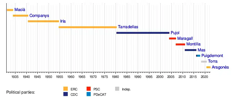 The list of presidents of the Government of Catalonia compiles the official list of presidents of the Generalitat de Catalunya since its inception in 1359 to present time.[1] It has been the traditional way of listing presidents, starting with Berenguer de Cruïlles.[2][3][4] The most recent stable version of the list dates from 2003, by Josep M. Solé i Sabaté in his work Historia de la Generalitat de Catalunya i dels seus presidents.[5] The procedure to set up this list is the following: for the period of the medieval Generalitat (Deputation of the General),[6] the president was the most eminent ecclesiastic deputy of the Deputation of the General of Catalonia (popularly known as Generalitat),[7] a body of the Catalan Courts dissolved in 1716 and reinstated for two years in 1874. From April 1931 on, the list includes the elected presidents as well as the proclaimed exiled presidents during the Francoist dictatorship.[8] The functions of the President of the Government of Catalonia have varied considerably over history, in parallel with the attributions of the Generalitat itself.[9]